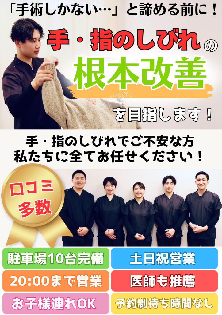 手や指のしびれは、神経の圧迫や血流の悪化が原因で起こることが多く、適切な施術を受けることで症状を改善できます。当整骨院・接骨院では、しびれの根本原因を分析し、神経や血流のバランスを整える施術を行っています。「しびれが続いている」「物をつかみにくい」「仕事や生活に影響が出ている」とお悩みの方は、ぜひ一度、当整骨院・接骨院もご相談ください。しびれを軽減し、快適な生活を取り戻しましょう。